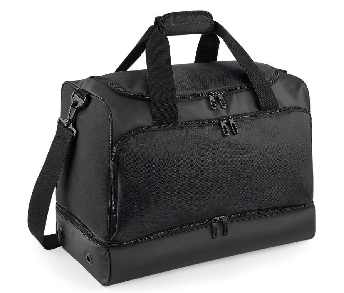 TearAway label for ease of rebranding. Front pocket designed for easy decoration. Dual compartment design. Structured, ventilated base compartment. Wipe clean interior. Internal valuables pocket. External mesh pocket. Internal mesh pockets. Detachable adjustable shoulder strap with pad. Padded handle. Dimensions: 52 x 29 x 40 cm. Capacity: 50 litres. Maximum Embroidery: 18 cm tubular hoop. Maximum Print Area: 43 x 18 cm