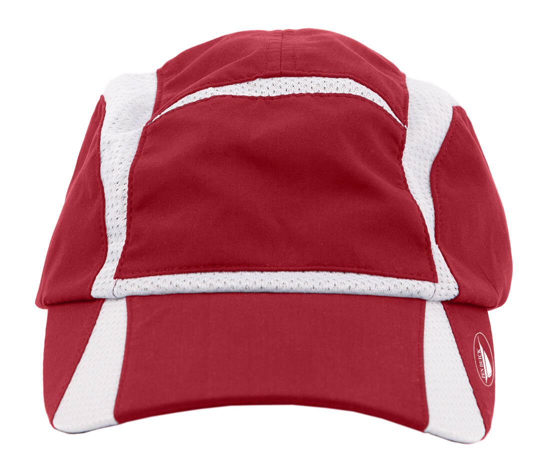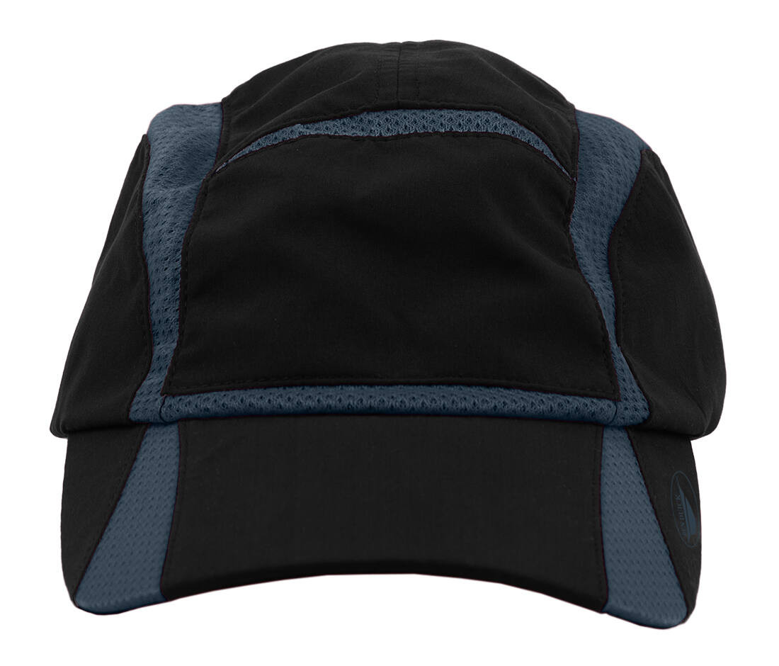 Müts kontrastsete võrgupaneelidega. Sulgemine kahekordse elastse ribaga ja stopperiga. Kerge ja õhuline. Ideaalne tikandiks ja siiditrükiks.