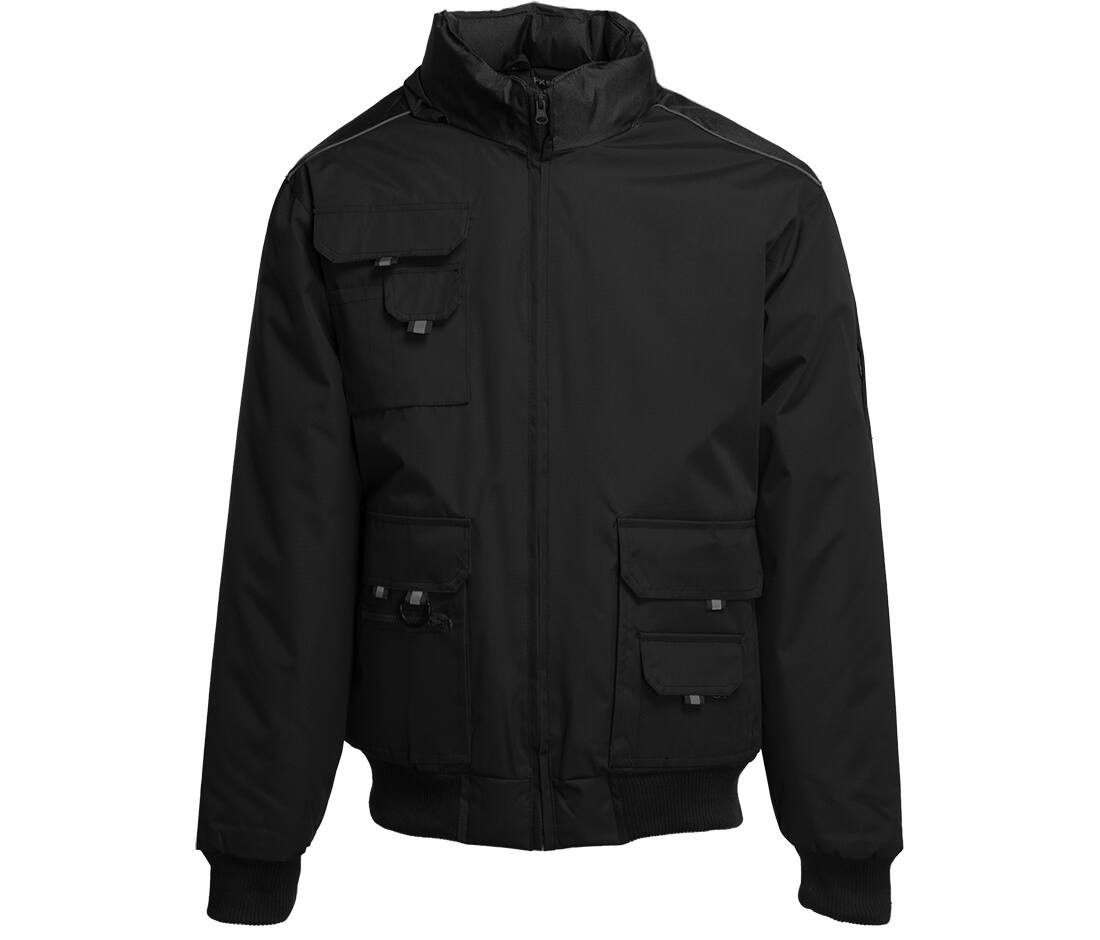 Waterproof and windproof. 12 outside pockets: 1 zipped front pocket, 5 Velcro® pockets, 2 side pockets, 3 pen pockets and zipped sleeve pocket. Reflective stripes on pockets and shoulders. Hood in collar, adjustable with stopper. Large zip. Ribbed cuffs and hem. Velcro® inside pocket. Marking access. Available in bodywarmer ref. PK355.